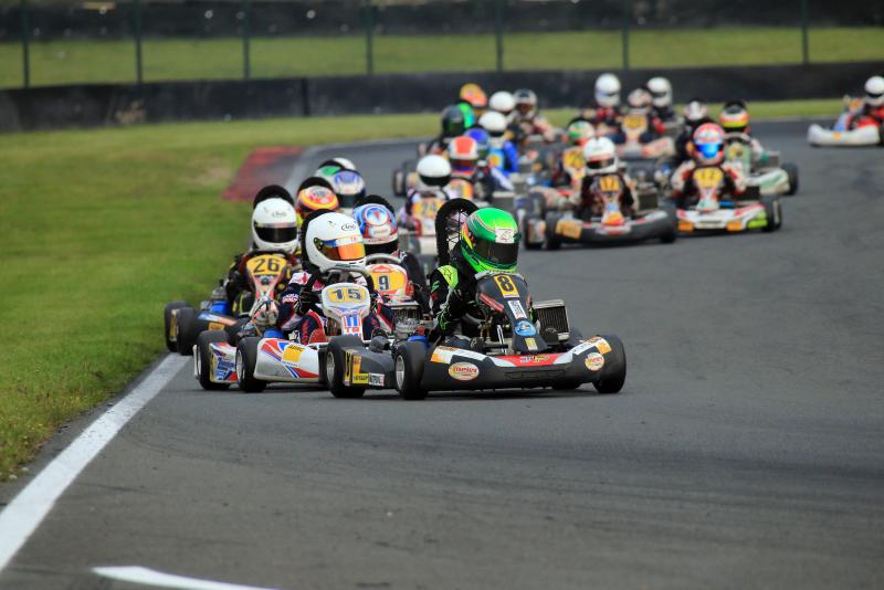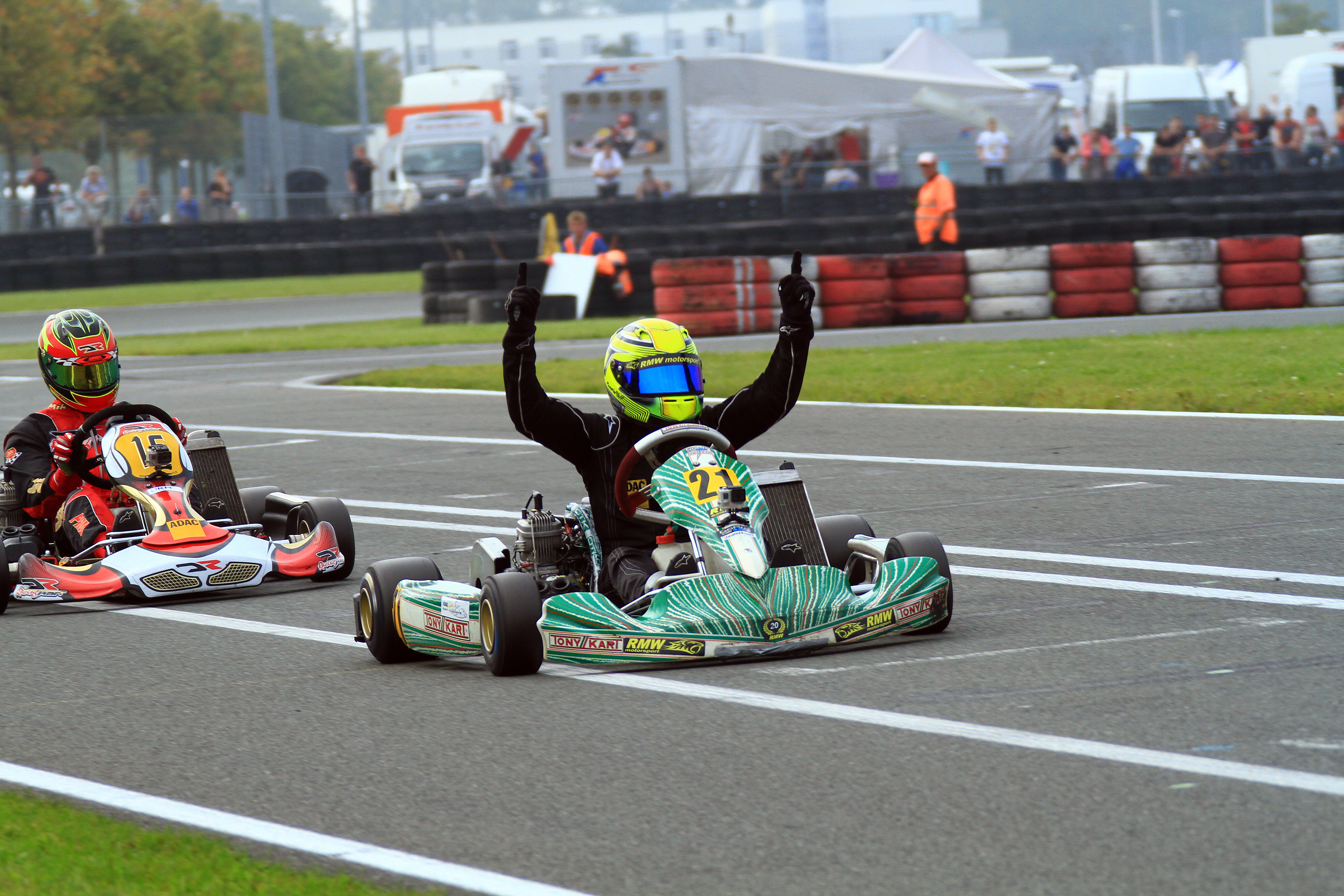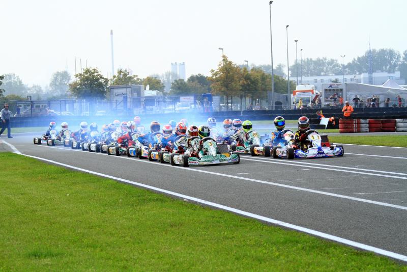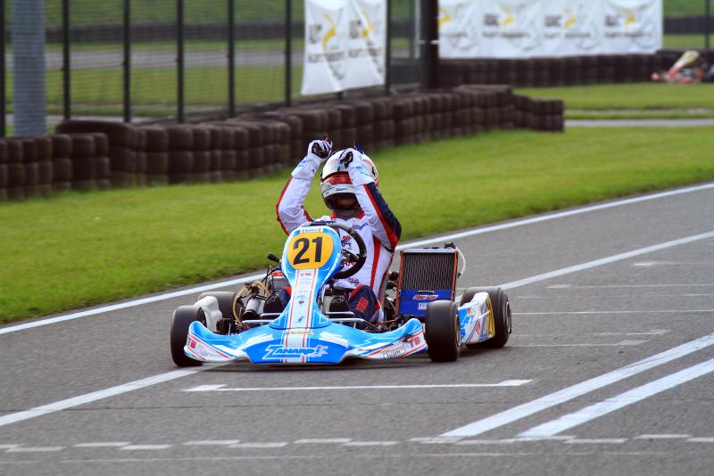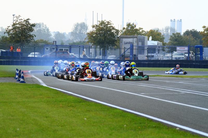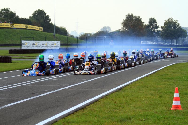 Doch pünktlich zum ersten Finale sorgte das Wetter für Aufsehen. Regen setzte ein und das gesamte Feld ging mit profilierten Reifen an den Start. Erster Leidtragender der schwierigen Streckenbedingungen war Polesetter Tobias Dauenhauer: Direkt nach dem Start rutschte er ins Aus und fiel weit zurück. Neuer Spitzenreiter war Julian Hanses, aber auch für den Meisterschaftsführenden lief nicht alles glatt. Während harter Positionskämpfe verlor er etwas an Boden und kam nur als Sechster ins Ziel. An der Spitze, war währenddessen Lasse Weis (Peiting-Birkland/MC-Dießen im ADAC) nicht zu stoppen. Mit einem großen Vorsprung feierte er seinen ersten Erfolg in Deutschlands stärkster Kartrennserie: „Zu Beginn war das Rennen gar nicht einfach. Es ging hin und her, doch ab der Hälfte habe ich meine Position ausgebaut und sicher gewonnen.“ Die Entscheidung um Platz zwei war dagegen deutlich knapper. Gleich drei Fahrer duellierten sich über weite Strecken, beim Fallen der Zielflagge hatte Kevin Kratz (Haimhausen/RL-Competition.com) vor Simon Steffen (Minderlittgen/Dischner Racing Team) und Massimo Lo Bianco (Wolfsburg/RMW Motorsport) die Nase vorne. Giuliano Göbbels (Jülich/MSC Langenfeld e.V.) schloss die Top-Fünf ab.