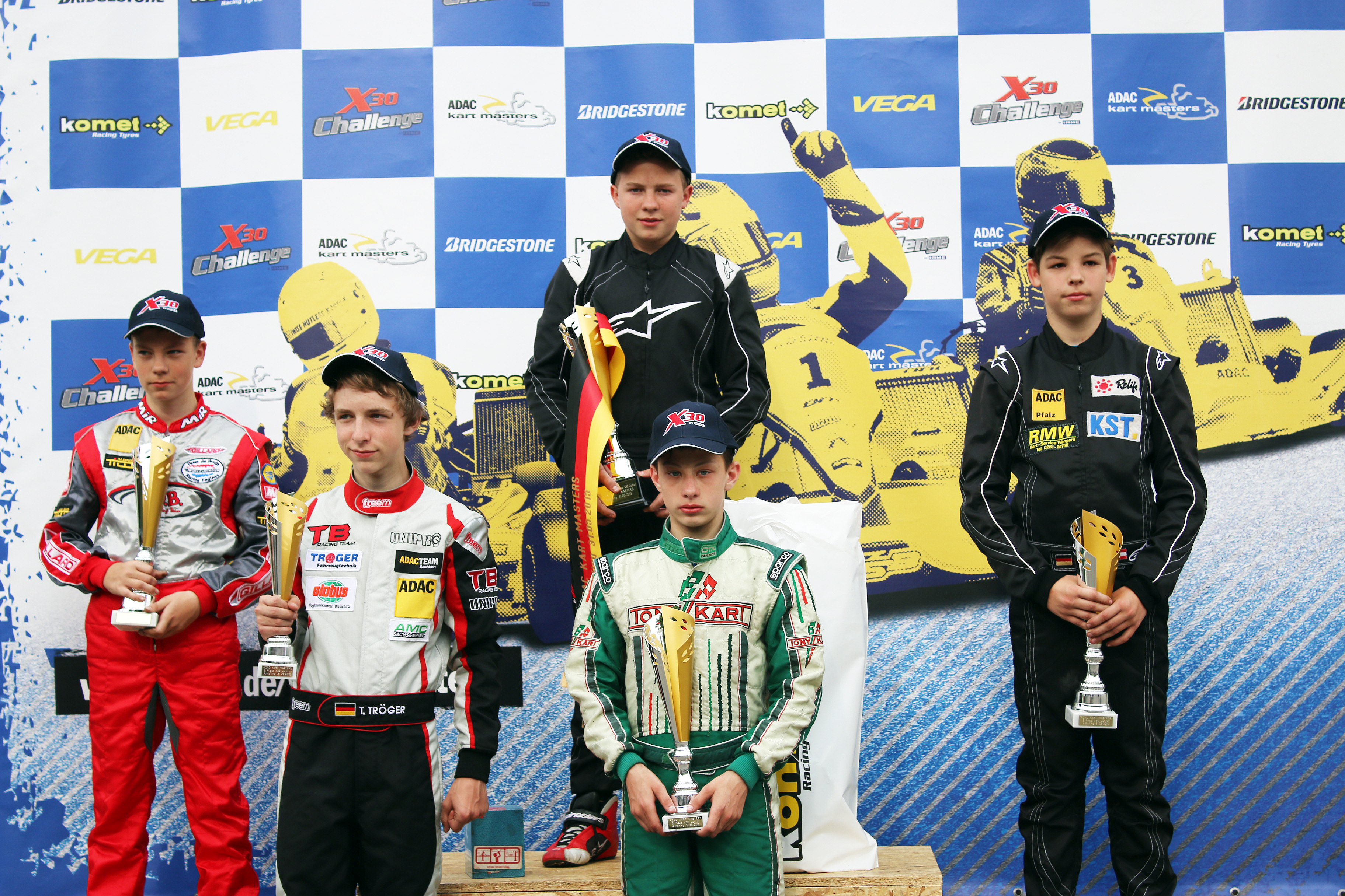 Aus der Pole-Position hatte der Berliner jedoch im ersten Rennen kein einfaches Spiel. Zwar gewann er den Start, doch der Druck seiner Verfolger war hoch. Im Verlauf der 14 Rennrunden fuhren die Youngsters wie an einer Perlenschnur gezogen und wechselten mehrmals die Positionen. Kurz vor Rennende führte der amtierende Vizechampion Miroslaw Kravchenko (Krefeld/DS Kartsport) das Feld an und ließ sich seinen ersten Saisonsieg nicht mehr nehmen. Als Zweiter folgte Davids Trefilovs vor Hugo Sasse (Dürrröhrsdorf/ADAC Sachsen e.V.), Luca Voncken (Solberg/DS Kartsport) und Jakob Bergmeister (Langenfeld/DR Germany). „Die zahlreichen Positionswechsel haben Spaß gemacht. Man musste nur aufpassen, ein kleiner Fehler hätte viele Plätze gekostet. Der Sieg ist super und die Punkte für die Meisterschaft wichtig“, strahlte Laufsieger Miroslaw Kravchenko auf dem Podium.