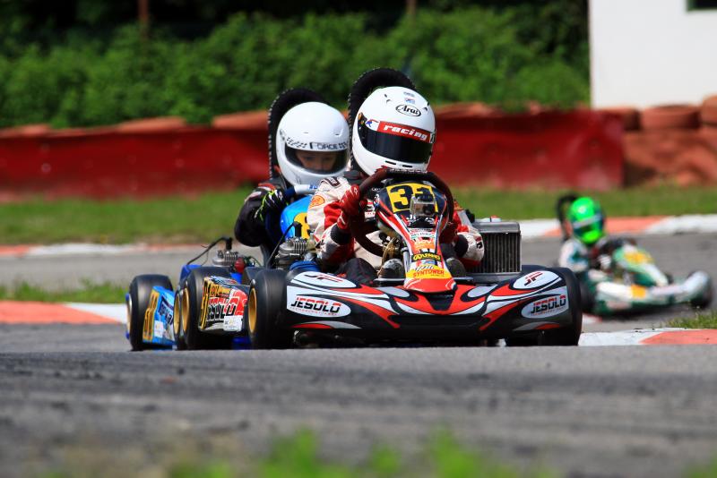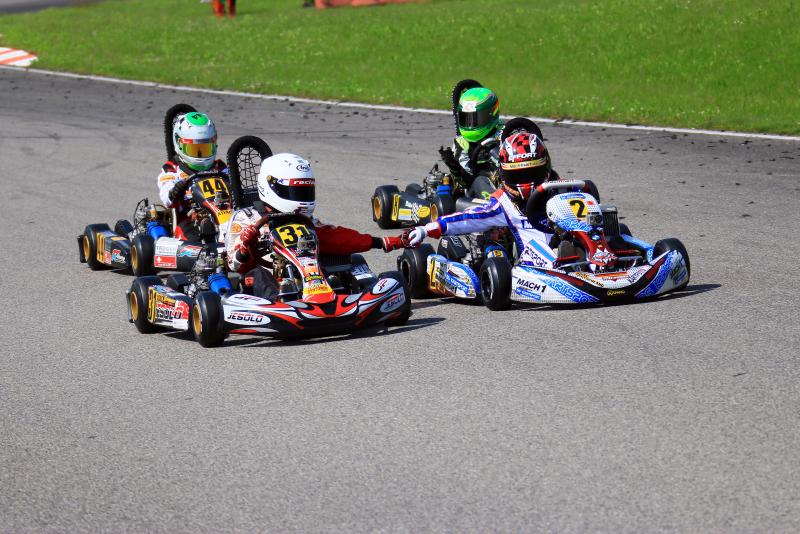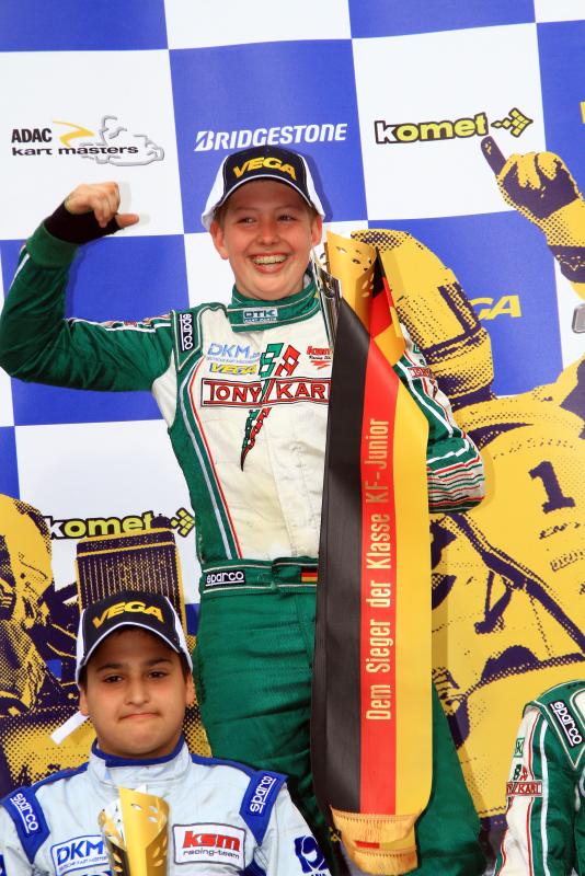 Schon im Zeittraining spiegelte sich die Qualität des KF Junior-Feldes wieder. Die ersten 16 Fahrer trennten weniger als eine halbe Sekunde – schnellster Fahrer war Gianni Janzik (Stemwede/TR Motorsport). In den Heats büßte er seinen Rang aber ein, Robin Falkenbach (Köln/Stern Motorsport) übernahm mit einem Sieg und einem dritten Platz die Führung. Aus der ersten Reihe gewann der Kölner auch den Start des ersten Rennens, gab aber nach nur zwei Runden seine Position an Gianni Janzik ab. Der Jesolo-Pilot baute fortan seinen Platz kontinuierlich aus und sah das Ziel als klarer Sieger. Hinter ihm war die Entscheidung deutlich knapper – Robin Falkenbach und David Brinkmann (Bergheim/KSM Racing Team) komplettierten die Top-Drei. Als Vierter und Fünfter folgten Bent Viscaal (KSM Racing Team) und Marius Zug (Mitterscheyern/rl-competition.com).