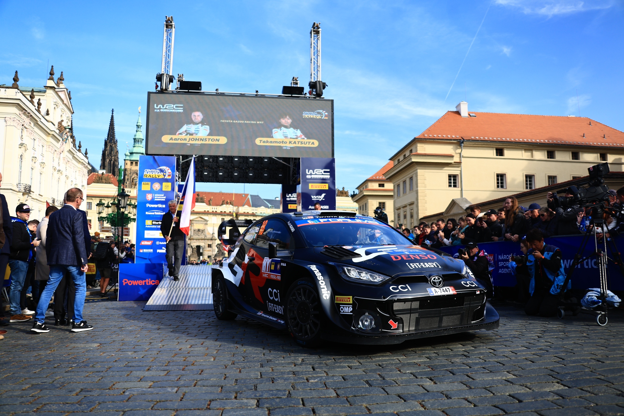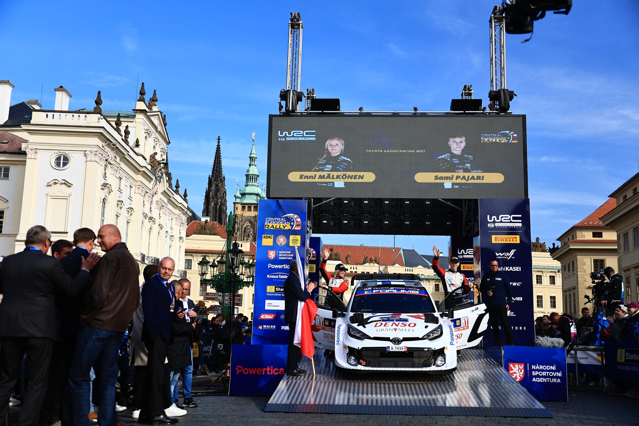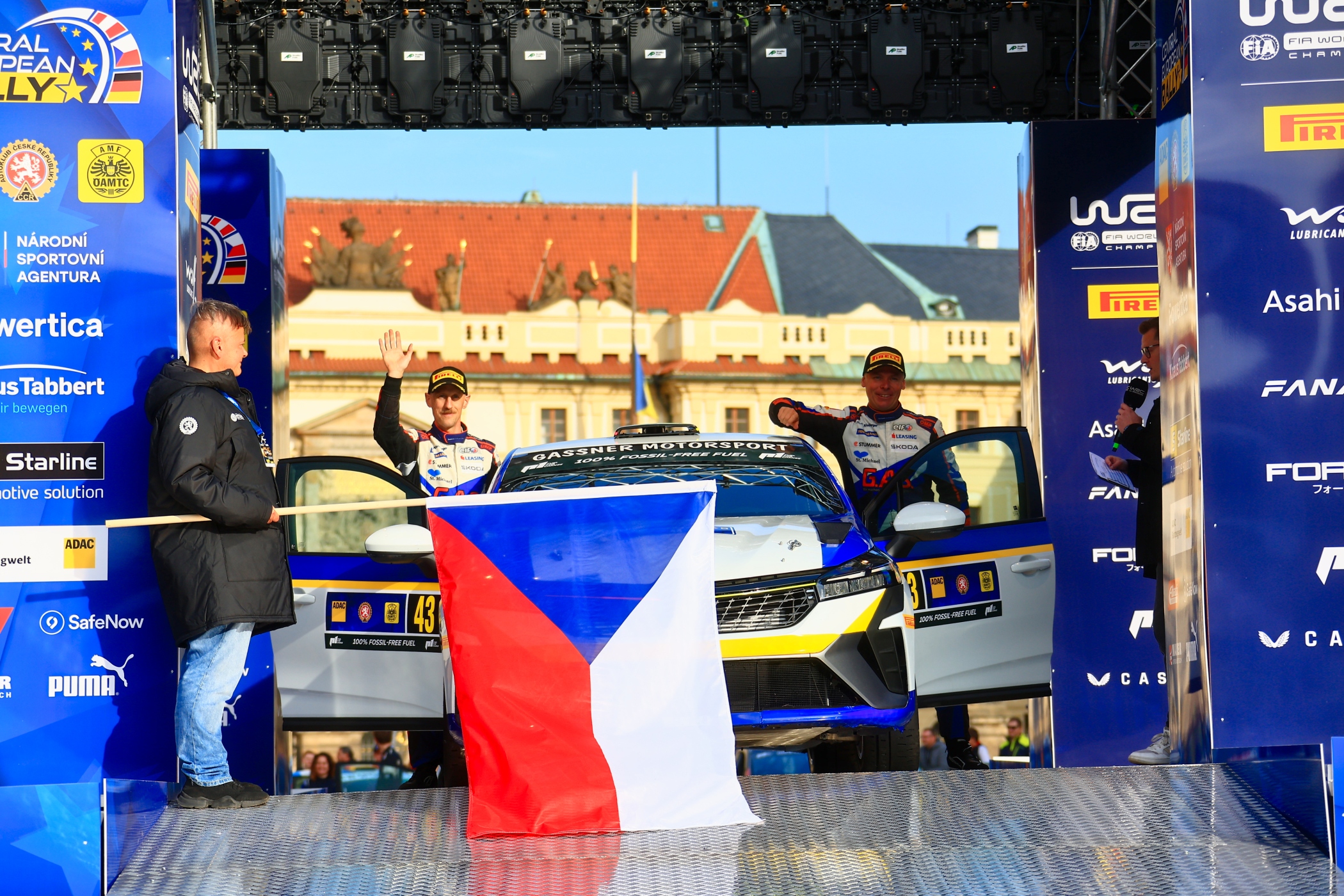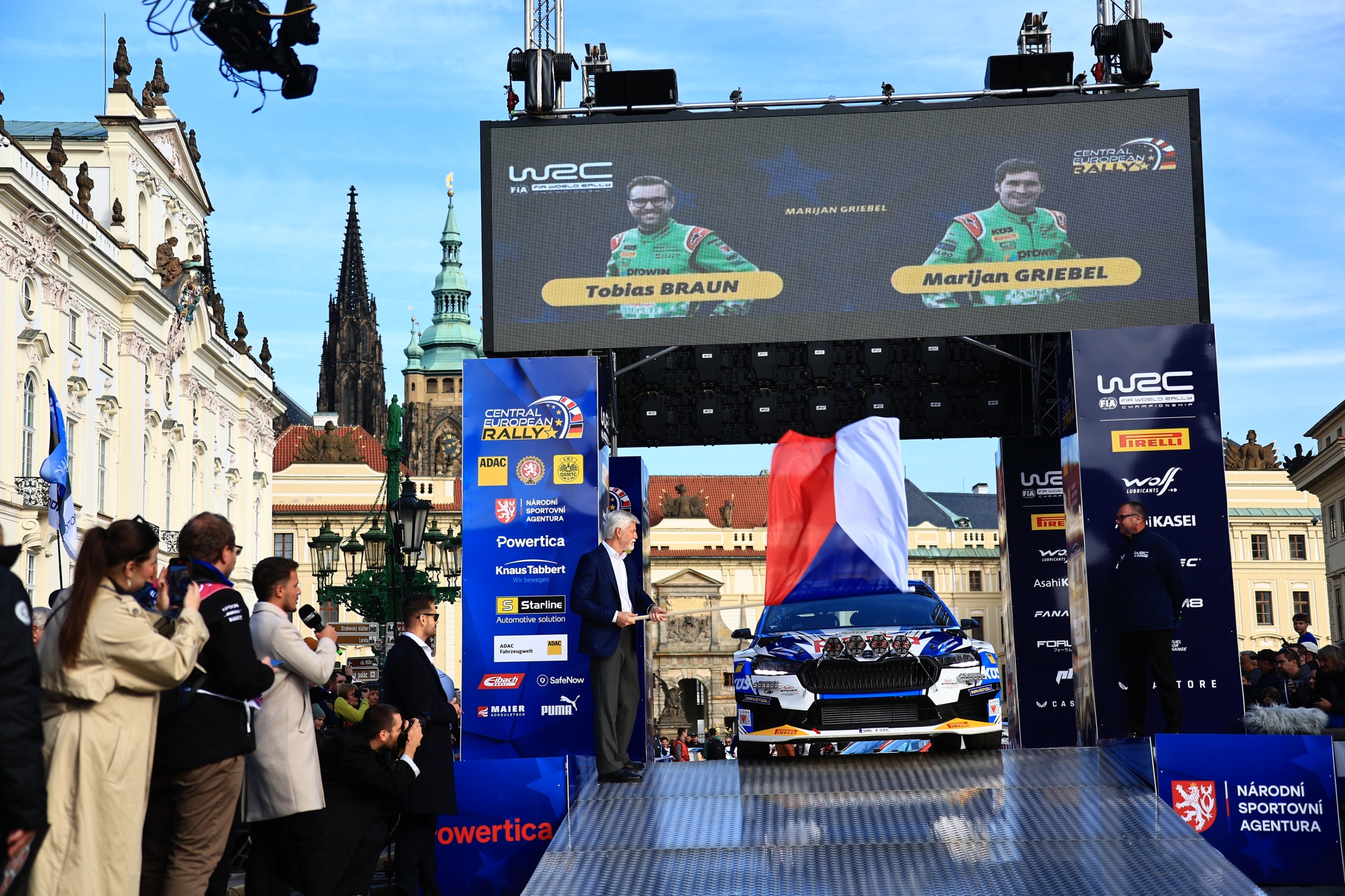 Der tschechische Staatspräsident Petr Pavel gab vor der Kulisse des Präsidentenpalastes auf dem Hradchin das Startsignal für die zweite Auflage der Central European Rally