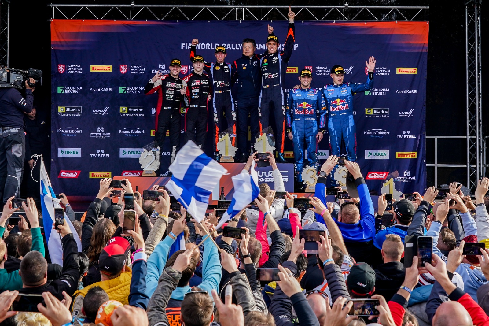 Die vorentscheidende Szene der Central European Rally spielte sich am Samstagvormittag ab, als Toyota-Pilot Elfyn Evans von der Piste rutschte und damit aus der Wertung kippte. Zwar konnte der Waliser am letzten Rallyetag noch einmal antreten, um auf der finalen Powerstage mit der Bestzeit fünf wertvolle Zusatzpunkte zu ernten. Das reichte aber nicht, um den als Gesamtzweiten ins Ziel gekommenen Teamkollegen Kalle Rovanperä noch abzufangen. Der Finne konnte sich vorzeitig als Weltmeister feiern lassen und freute sich: „Ich fühle mich richtig gut! Dieses Jahr war, für mich persönlich, noch wichtiger als das vergangene. Der Wettbewerb war härter und wir haben im Cockpit wirklich gute Arbeit geleistet. Der größte Dank gebührt natürlich Jonne Halttunen. Er ist der beste Beifahrer der Welt. Diesen Titel werde ich noch mehr genießen als meinen ersten.“ Bei anfangs wechselhafter Witterung hinterließen die Rallyefahrzeuge viel Schlamm auf der Strecke, die zu einer wahren Rutschbahn wurde. „Das waren die anspruchsvollsten Asphalt-Prüfungen, die ich bislang in meiner Karriere erlebt hatte“, staunte Weltmeister Rovanperä. Auch für Gesamtsieger Thierry Neuville war der Sieg enorm wichtig: Mit den gesammelten Punkten rückt er in der WM-Tabelle bis auf sieben Punkte sehr nahe an den Zweitplatzierten Evans heran und duelliert sich nun beim Saisonfinale in Japan mit dem Waliser um die Vizemeisterschaft. „Ich bin wirklich froh im Ziel zu sein“, atmete der Belgier bei der Siegerehrung in Passau auf. „Es war ein wahnsinnig anstrengendes und herausforderndes Wochenende. Wir haben einen guten Job gemacht und konstante Leistung gezeigt. Das hat sich letztlich ausgezahlt. Es war ein Erfolg des ganzen Teams an diesem Wochenende, wir können darauf wirklich stolz sein.“ Auf den Asphaltprüfungen im Dreiländereck konnte der Este Ott Tänak im Ford den beiden Schnellsten nicht gefährlich werden. Er reist aus Passau als WM-Vierter ab, wobei der Punkterückstand auf Neuville deutlich zugenommen hat.