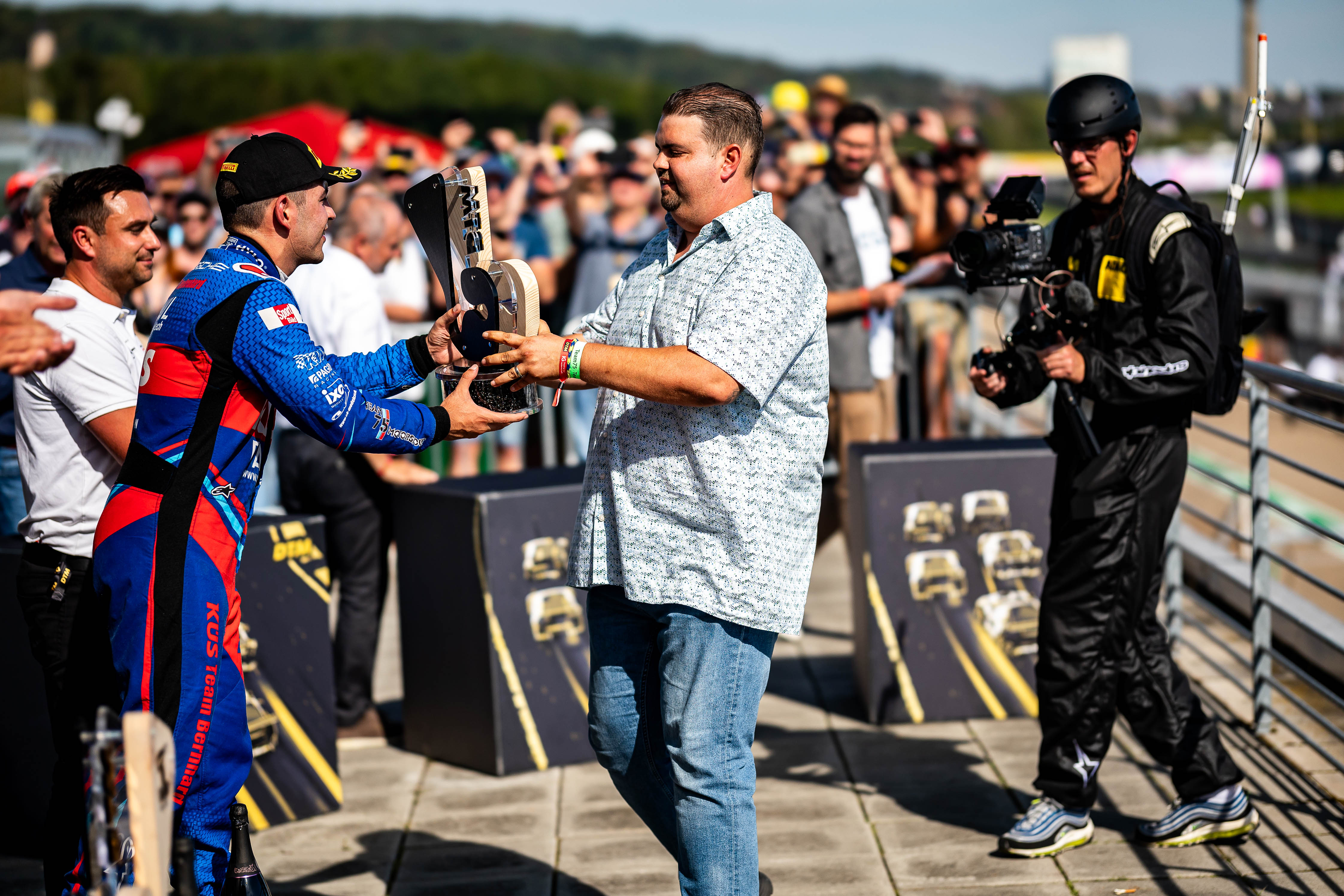 Professional darts player Gabriel Clemens is usually to be found on the oche throwing arrows. At the Sachsenring on Saturday, the 40-year-old DTM driver sent the DTM drivers onto the track with the “Drivers start your engines” sign. He was then on hand after the race to present the trophy for third place to Ayhancan Güven. “The German Giant” had previously taken a look round the paddock and pit lane, and was clearly impressed. “It is awesome how huge everything is, and the amount of effort that goes into the DTM. I once went to the 24-hour race at the Nürburgring, but that was more for the party. At the Sachsenring, I really got to know the motorsport, including a tour of the Team75 Motorsport garage with Timo Bernhard, and am impressed,” said the darts star. It was a similar story for cycling champion Robert Förstemann, who travelled the 50 kilometres or so from Greiz to check out the DTM. The world and European champion in the team sprint, and bronze medallist at the 2012 Olympic Games in London, was particularly taken by the DTM cars, which the two-wheel specialist inspected thoroughly. After the Sunday race, Förstemann presented the trophy for second place.