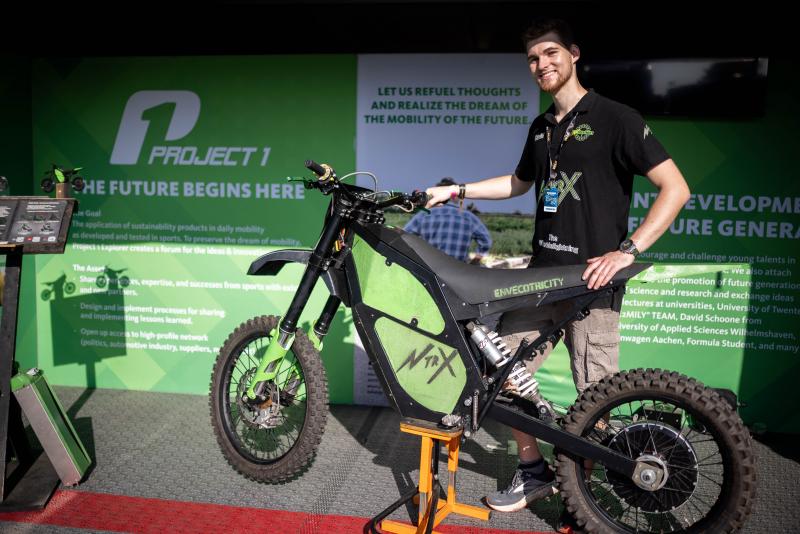 David Schoone from the Jade University of Applied Sciences in Wilhelmshaven presented his modular electric bike NTRX in the Green Room of DTM team Project 1 at the Sachsenring. Three solar batteries, which can be upgraded to a total of nine modules, an axial-flux hub motor, which the Bachelor graduate designed himself in his engineering module and has already patented in Germany. The range of the motorcycle is up to 450 kilometres with 60 hp. With add-on kits, the lightweight sport enduro can be transformed into an adventure bike suitable for longer journeys. The 26-year-old aims to start production of customer bikes in the middle of next year, and explains: “As well as the electric powertrain, only organic fibres like flax and hemp are used in the production of the chassis. As such, the bike is made solely from sustainable components.”