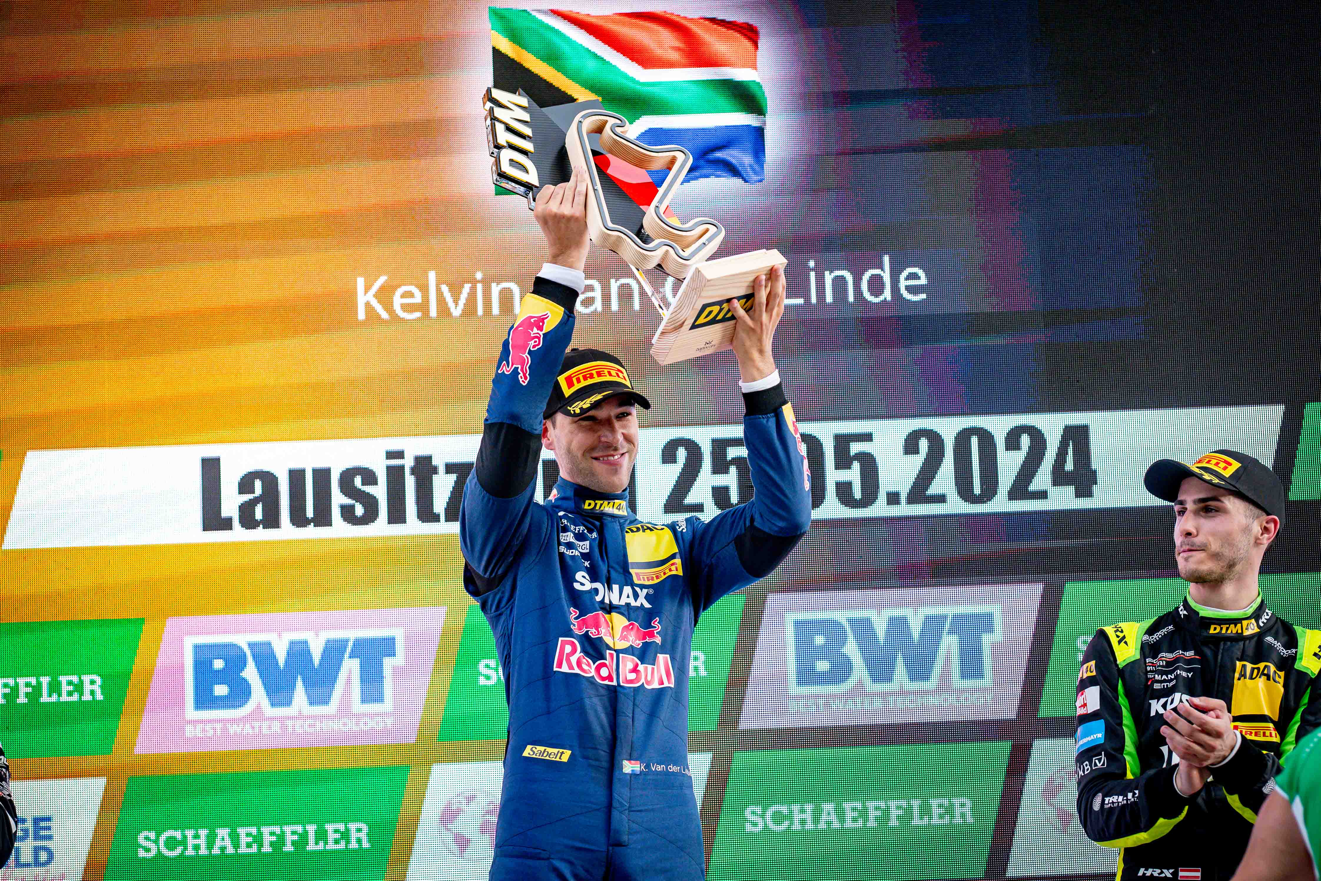 Klettwitz. Sintflutartiger Regen und zwei Rennunterbrechungen konnten Kelvin van der Linde (ZA) am Samstag auf dem Dekra Lausitzring nicht stoppen. Der Audi-Pilot von Abt Sportsline blieb bei teilweise widrigen Bedingungen cool, machte keine Fehler und feierte nach 38 Runden seinen sechsten DTM-Erfolg. „Was für ein chaotisches Rennen. Der Schlüssel zum Erfolg war, dass ich in der hektischen Anfangsphase die Führung verteidigen konnte. Denn an der Spitze hatte ich deutlich bessere Sichtverhältnisse. Trotzdem war es Racing am Limit, weil gerade zu Beginn extrem viel Wasser auf der Strecke stand“, erklärte van der Linde, der damit die Tabellenführung übernahm. Mit einem Rückstand von rund 2,5 Sekunden belegte Maro Engel (Monaco/Mercedes-AMG Team Winward) im Mercedes-AMG GT3 dank einer klugen Taktik Platz zwei. Titelverteidiger Thomas Preining (A) wurde im Porsche 911 GT3 R vom Team Manthey EMA Dritter.