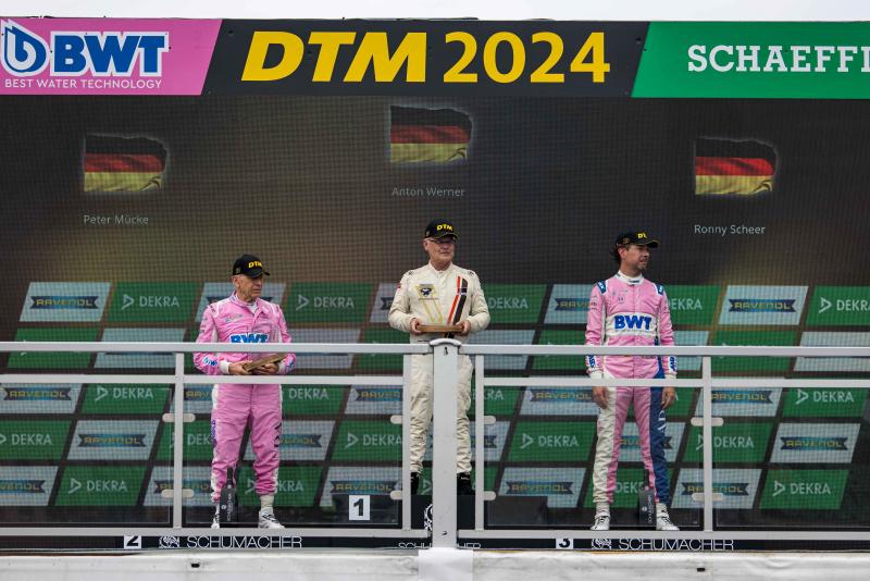 Peter Mücke erreichte die Ziellinie als Zweiter, hatte aber bereits einen Rückstand von gut 23 Sekunden auf Werner. „Ich habe zu lange gebraucht, die Vorderreifen meines Autos zum Arbeiten zu bekommen. Ich denke, ich muss etwas aggressiver fahren, bin mit dem Mercedes aber noch in der Lernphase. Insgesamt war es ein schönes Wochenende, an dem glaube ich alle – Fans, Fahrer und Teams – ihren Spaß hatten.“ Der Berliner sah sich zu Beginn des Rennens in einem harten Duell gegen Altfrid Heger (Audi V8 DTM), in dem beide Kampfhähne kollidierten. Die Rennleitung sah die Schuld bei Heger und bat ihn wenig später zu einer Durchfahrtsstrafe. Damit fiel der Audi-Pilot aus dem Fight um den dritten Platz heraus, der sich dank Ronny Scheer mittlerweile zu einem Dreikampf entwickelt hatte. Scheer hingegen hielt lange den Anschluss an Mücke, musste ihn letztendlich aber ziehen lassen. „Ich denke, ich hätte Peter sowieso nicht überholen können, denn dafür ist sein Mercedes einfach zu gut und auch deutlich jünger als mein Ford. Mit der dritten Position bin ich aber sehr glücklich, zumal ich gestern noch einen Ausfall wegen technischer Probleme hinnehmen musste.“
