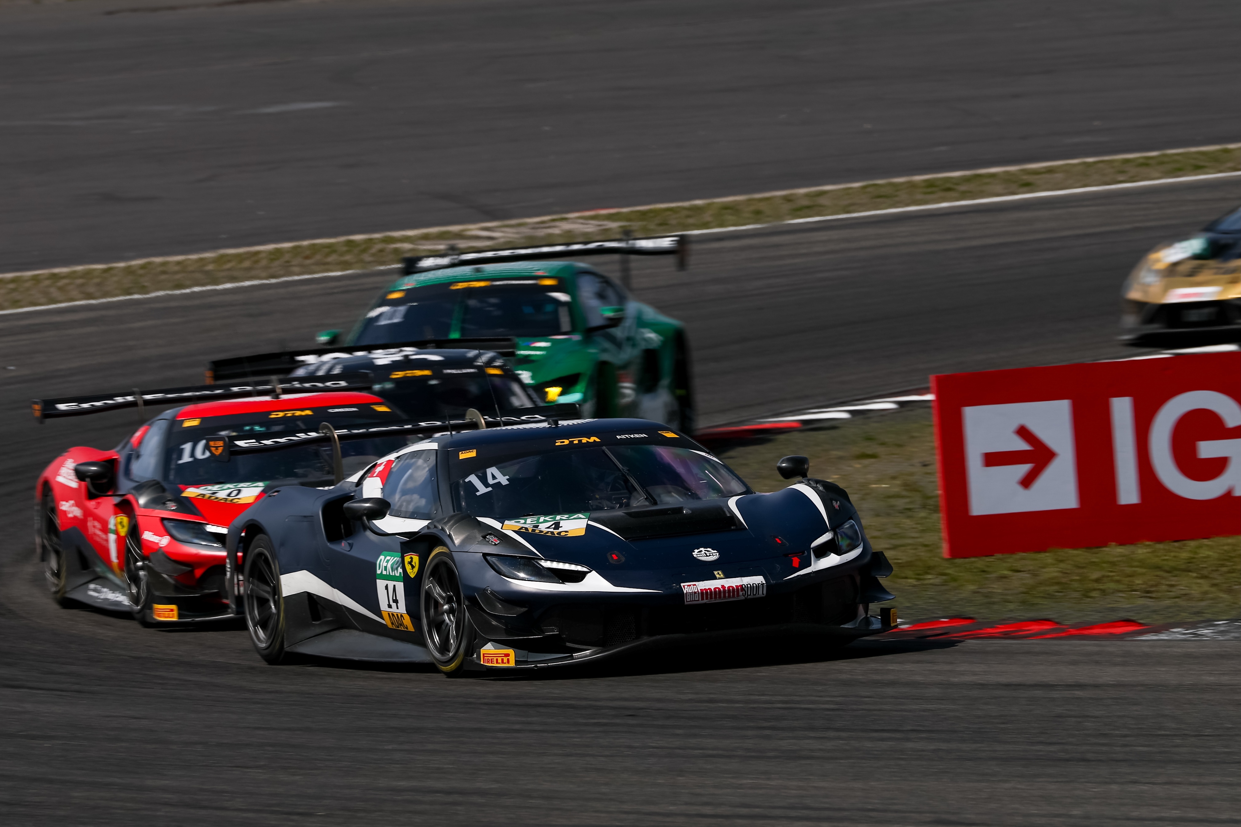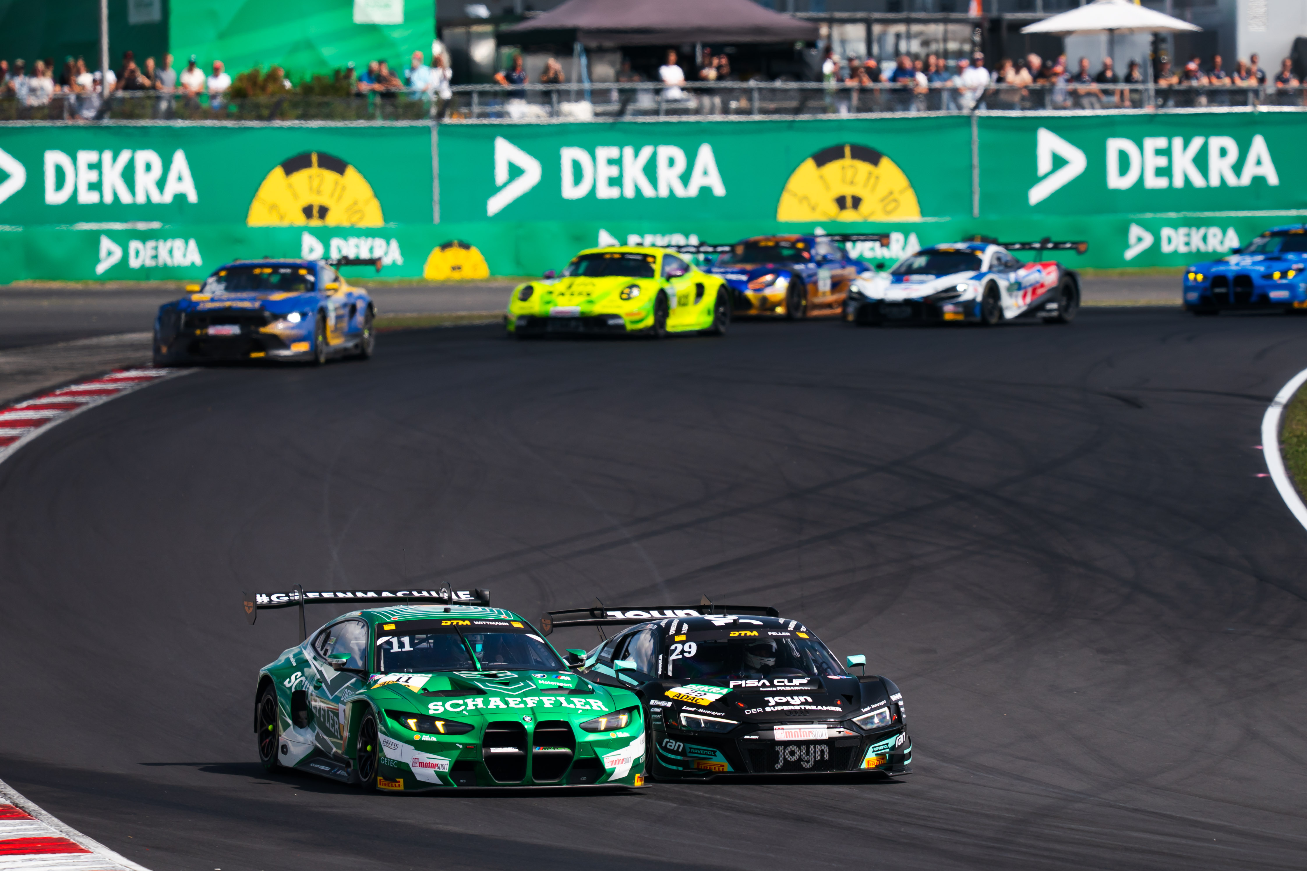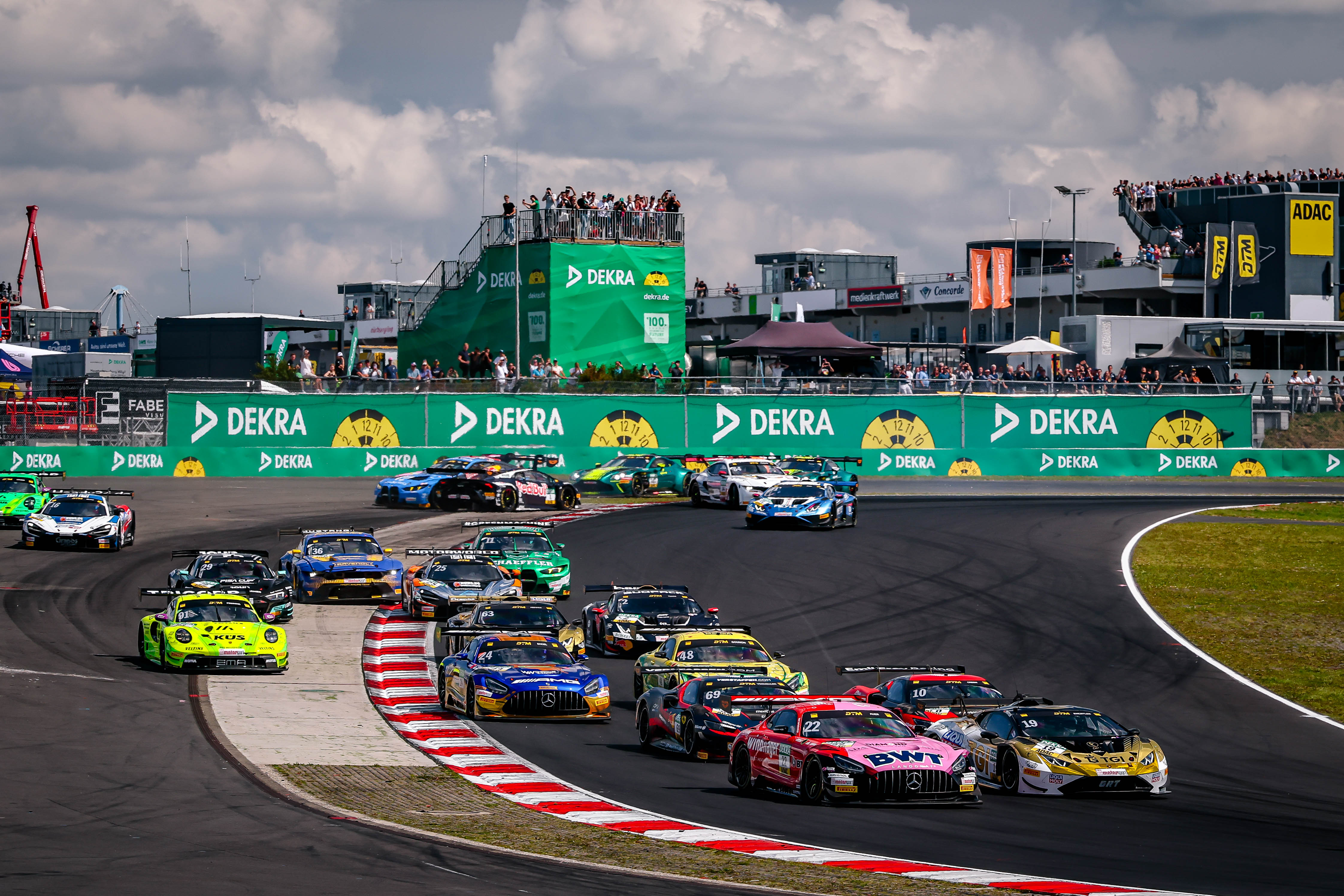 Das neunte DTM-Rennen begann am Samstagmittag mit einer hektischen Anfangsphase und musste nach mehreren Kollisionen unterbrochen werden. Nach dem Re-Start blieb Pole-Setter Aitken in Führung, dahinter schob sich Green auf Platz zwei vor. Luca Engstler (Kempten/TGI Team Lamborghini by GRT), Lucas Auer (A/Mercedes-AMG Team Landgraf) und Jordan Pepper (ZA/TGI Team Lamborghini by GRT) folgten auf den Rängen drei bis fünf.