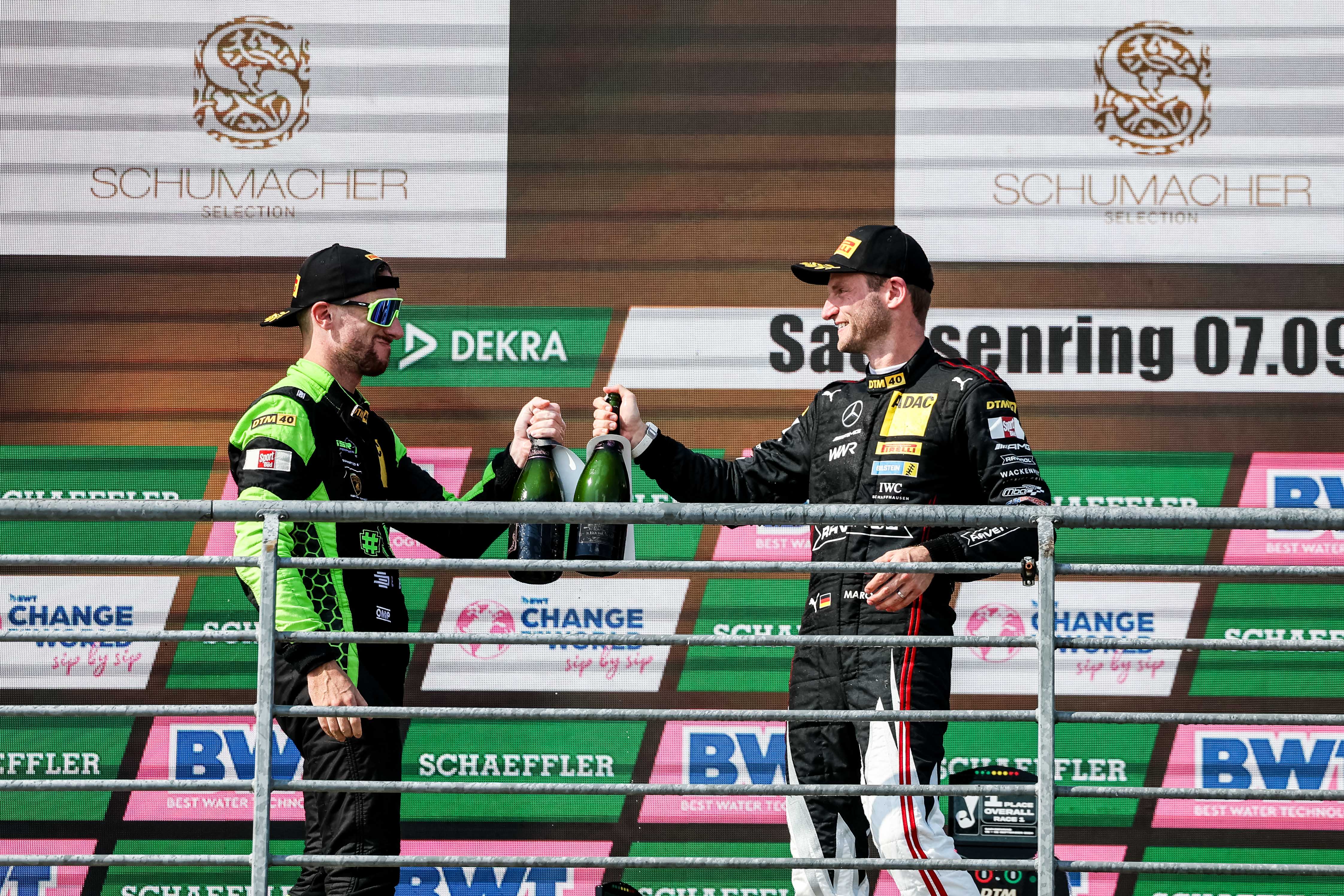 Mirko Bortolotti und Maro Engel (l-r) feiern auf dem DTM-Podium