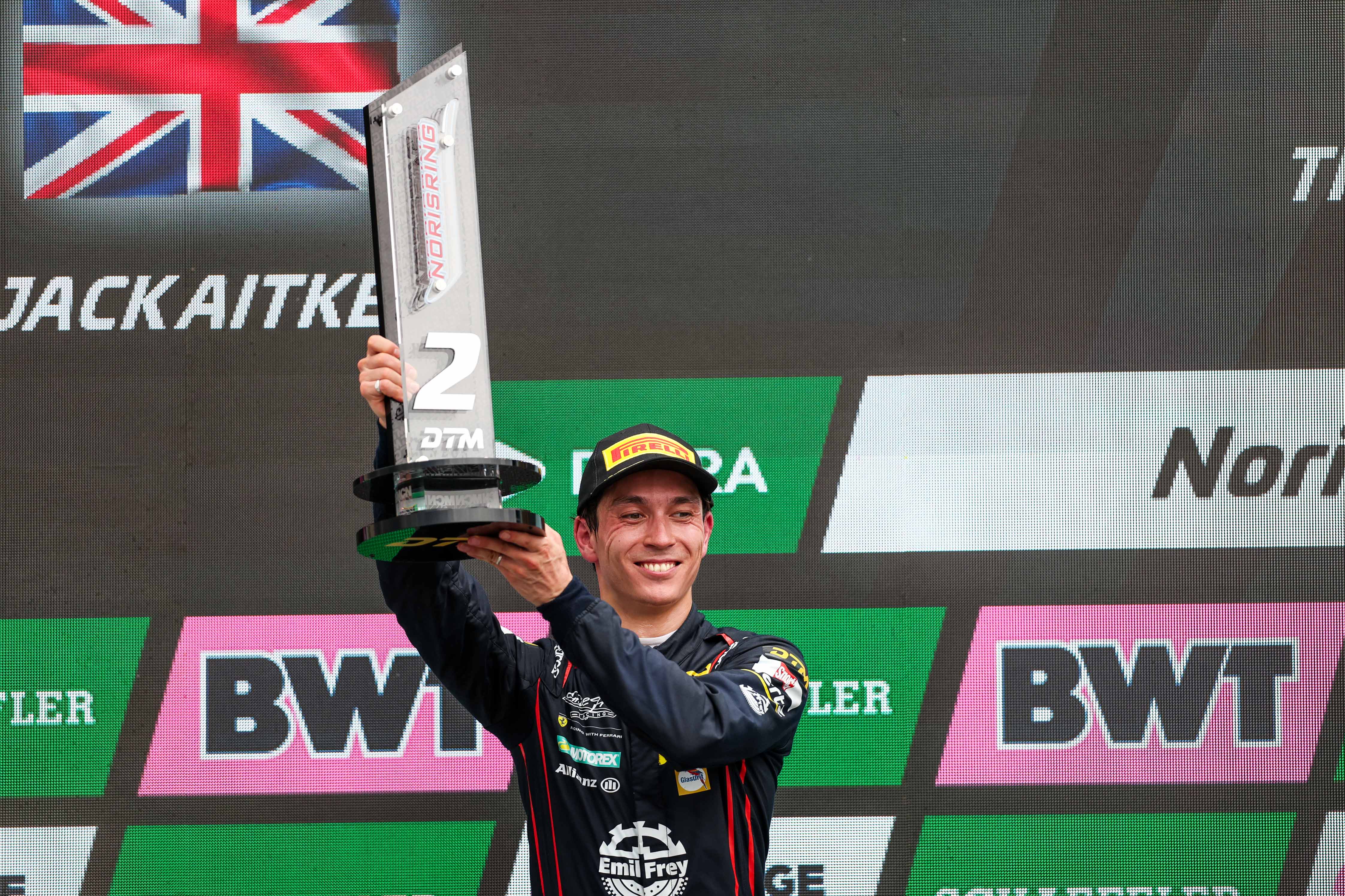 Mit dem Siegerpokal ganz oben auf dem DTM-Podium: Jordan Pepper