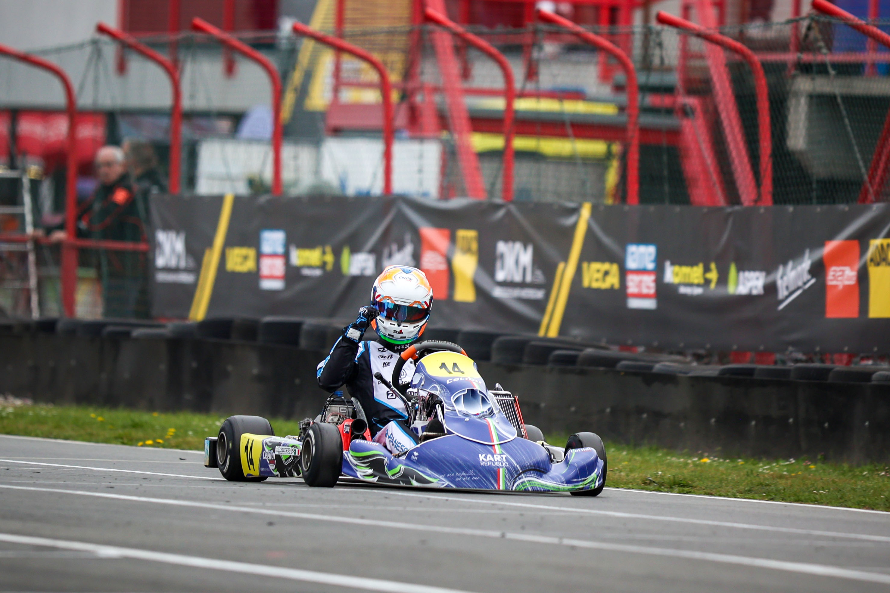 Zum Super Heat am Sonntag brachte eine nasse Strecke neue Spannung ins Geschehen. Albanese verlor seinen Spitzenplatz und kam nur als Vierter in das Ziel. Den Sieg holte sich Emilien Denner (Formula K SRP Factory Team) aus Frankreich. Auf trockener Strecke rückte Albanese im Finale das Klassement schnell wieder gerade. Direkt vom Start weg war er Erster und kontrollierte seine Position bis ins Ziel. „Wir hatten ein durchweg gutes Wochenende und konnten vom Zeittraining an die Pace setzen. Allein auf der feuchten Strecke im Super Heat haben wir etwas verloren.“, resümierte der Meisterschaftsführende. Hinter dem Italiener reihte sich Kajak gefolgt von Dion Van Werven (CPB Sport), Jean Luyet und David Trefilov (Formula K SRP Factory Team) ein.