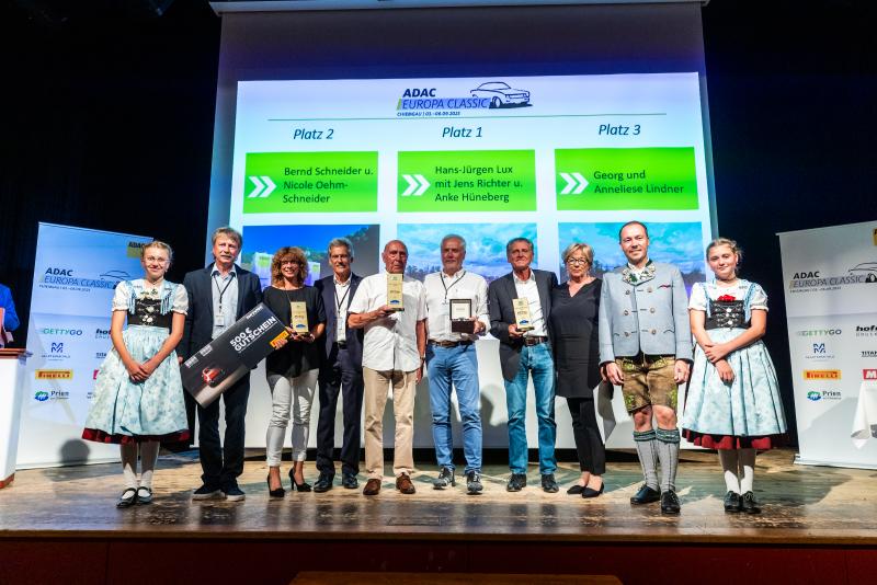(V. l. n. r.): Bernd Schneider und Nicole Oehm-Schneider (2. Platz), Prof. Dr. Mario Theissen (ADAC Klassik Referent), Hans-Jürgen Lux und Jens Richter (Platz 1), Georg und Anneliese Lindner (Platz 3), Herbert Reiter (Leiter der Tourist Information Aschau
