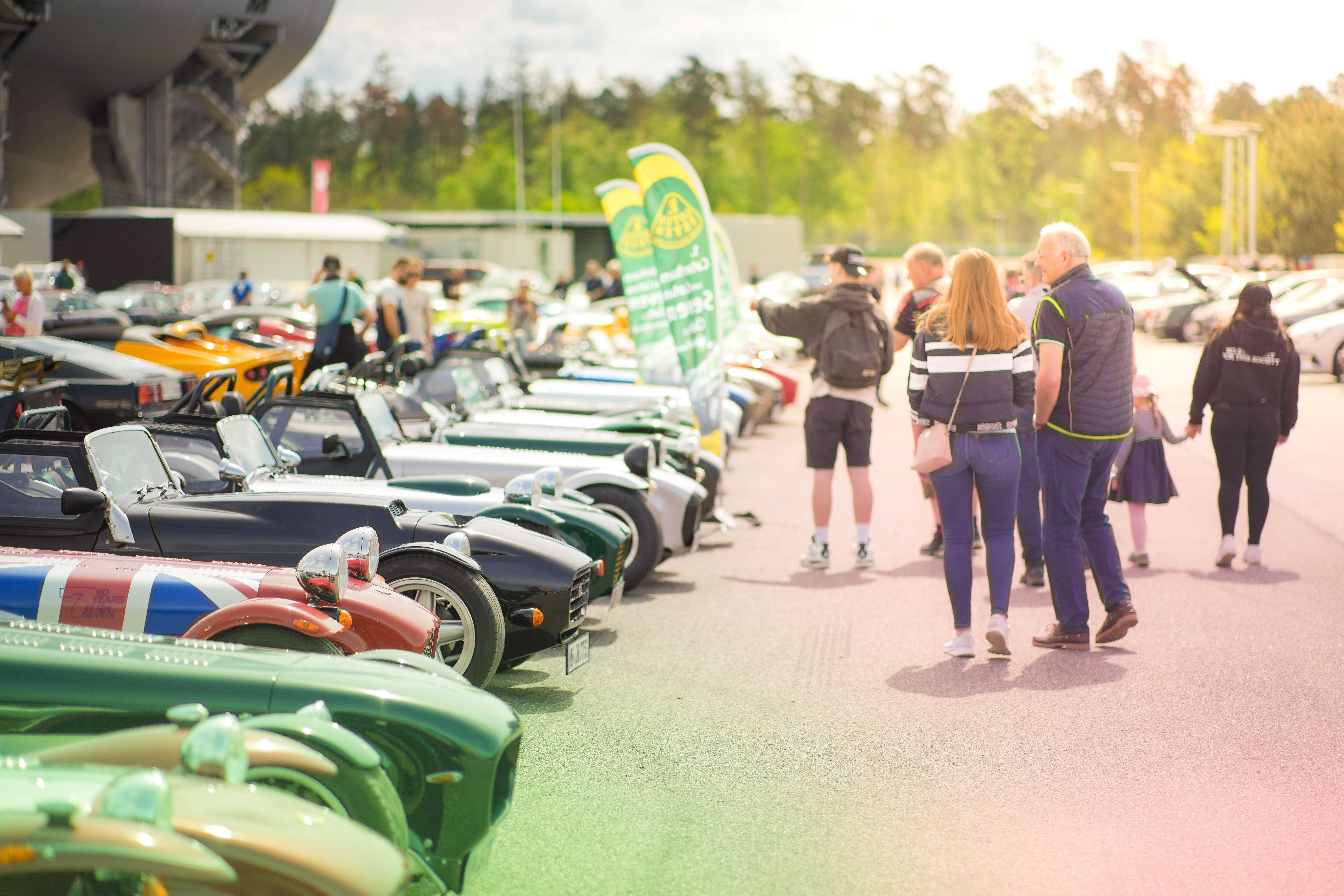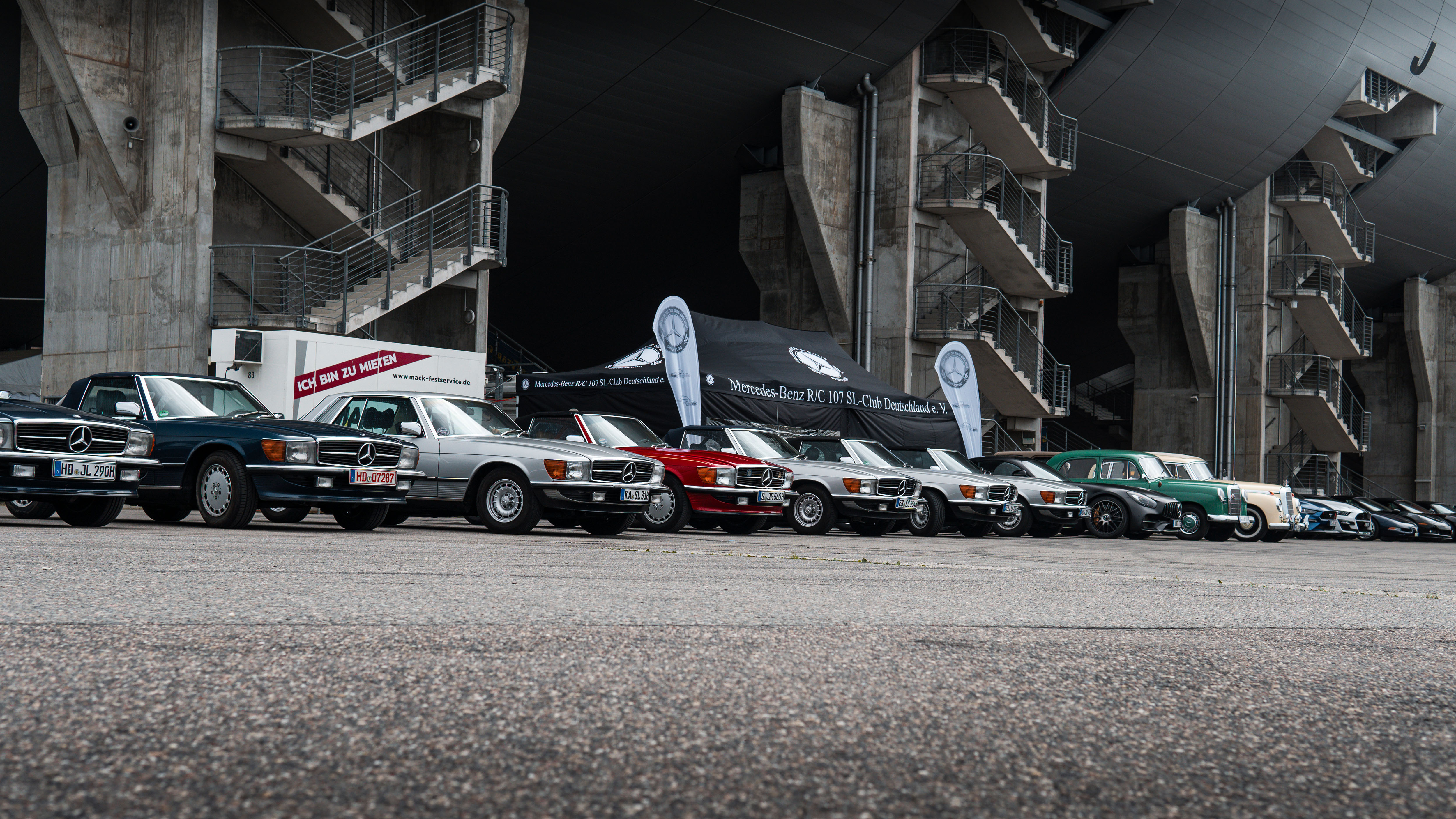 Das Markenclubareal verwandelt die Osttribüne in ein Freilicht-Museum aus Chrom und Blech (Foto: Mercedes-Benz R/C 107 SL-Club Deutschland e.V.)