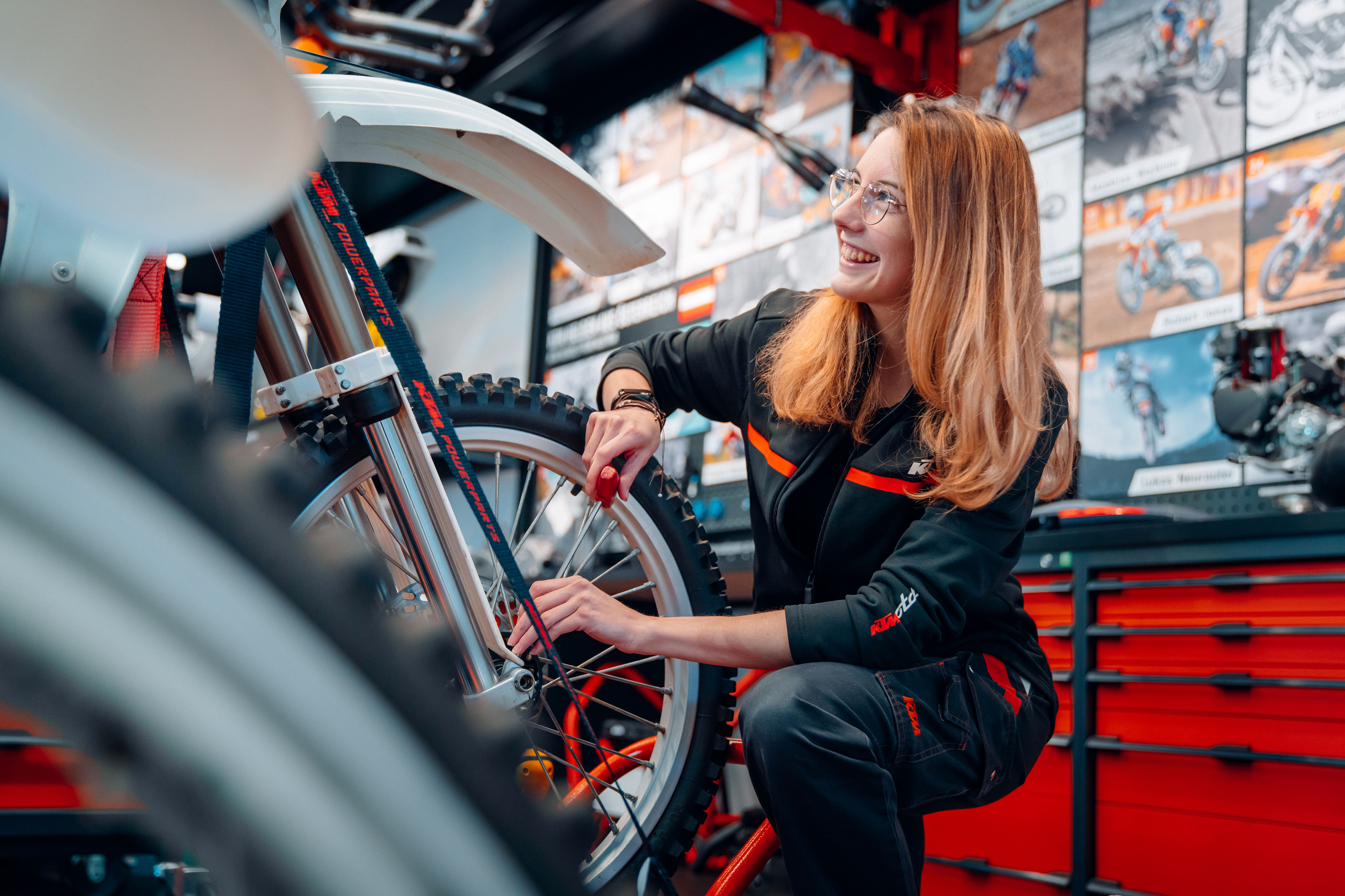 Technikbegeisterte können der erfahrenen Mechanikerin Nina Etzkorn, Workshop Specialist aus dem KTM Museum in Mattighofen, über die Schulter sehen (Foto: Felix Steinreiber)