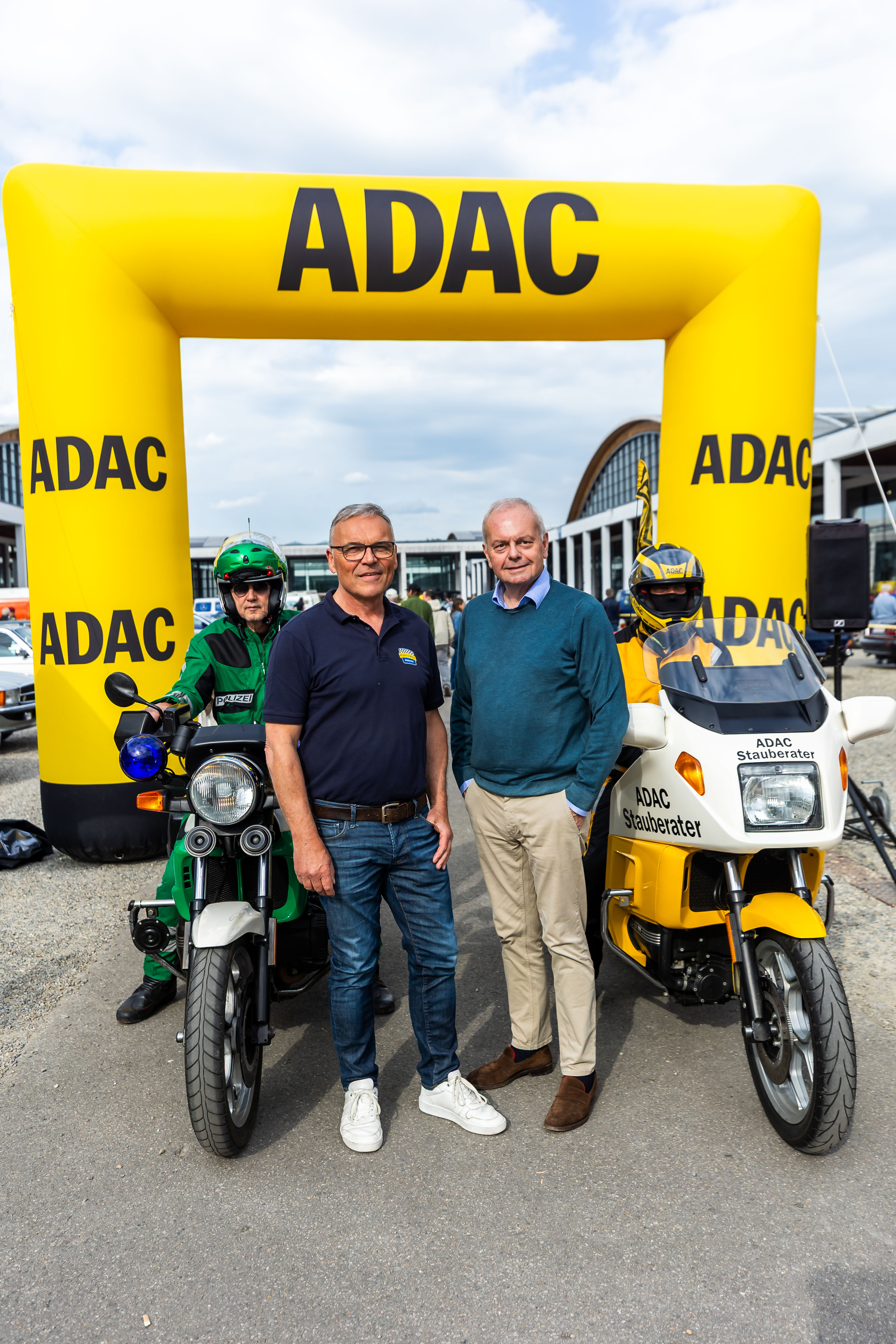 Zielankunft bei der ADAC Youngtimer Tour Bodensee: Projektleiter der Klassikwelt Bodensee Roland Bosch (Zweiter von links) und ADAC Tourismuspräsident Karlheinz Jungbeck (Zweiter von rechts) zusammen mit der Motorradstaffel vom Polizeimuseum StuttgartZiel