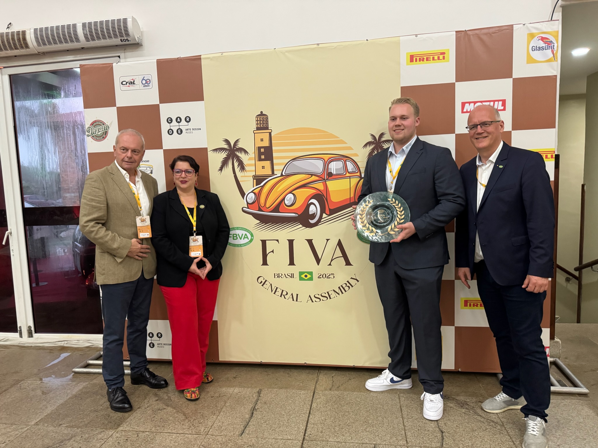 Bei der Verleihung des FIVA Culture Awards in Brasilien (v.l.n.r.): Karlheinz Jungbeck (FIVA Vice President for Culture and Youth & ADAC Tourismuspräsident), Nataša Grom Jerina (FIVA Senior Vice President Internal Affairs) Carl-Philip Kress (Nachwuchsrefe