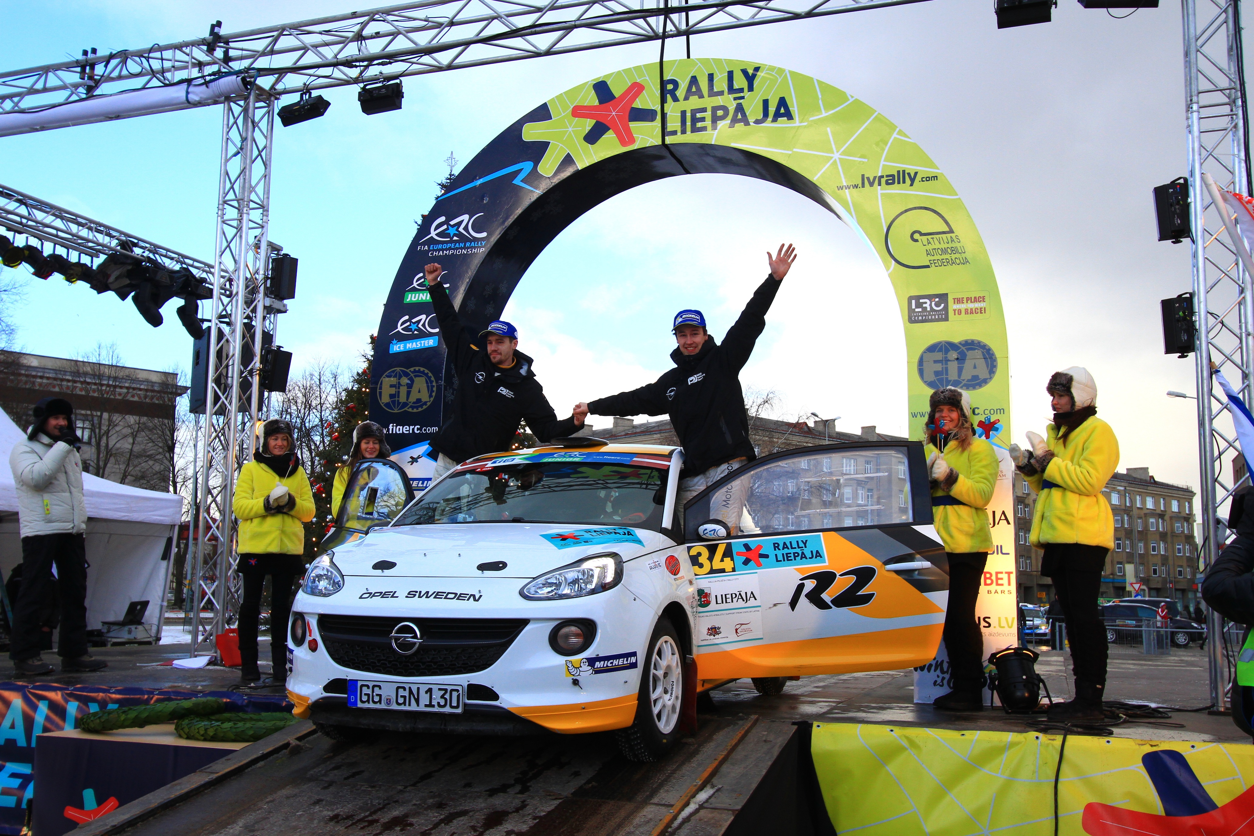 Rüsselsheim/München. Sensationeller Saisonauftakt für das ADAC Opel Rallye Junior Team! Bei ihrem ersten Auftritt als Opel-Werkspiloten gewannen Emil Bergkvist (20, Torsåker) und sein Beifahrer Joakim Sjöberg (29, Ösmo) im Werks-Opel ADAM R2 den ersten Lauf zur Rallye-Junior-Europameisterschaft (FIA ERC Junior) im Rahmen der Rallye Liepaja in Lettland. Die beiden Schweden siegten nach elf höchst anspruchsvollen Wertungsprüfungen (WP) am Ende eine gute halbe Minute vor dem Norweger Steve Rokland sowie dem Letten Ralfs Sirmacis (beide Peugeot 208 R2) und übernahmen damit auch die Führung in der Gesamtwertung der FIA ERC Junior. Nebenbei klassierten sich die letztjährige Gesamtsieger des ADAC Opel Rallye Cups mit ihrem „nur“ 190 PS starken Fronttriebler inmitten der allradgetriebenen, deutlich leistungsstärkeren Konkurrenz auf dem beeindruckenden sechsten Rang in der Gesamtwertung.