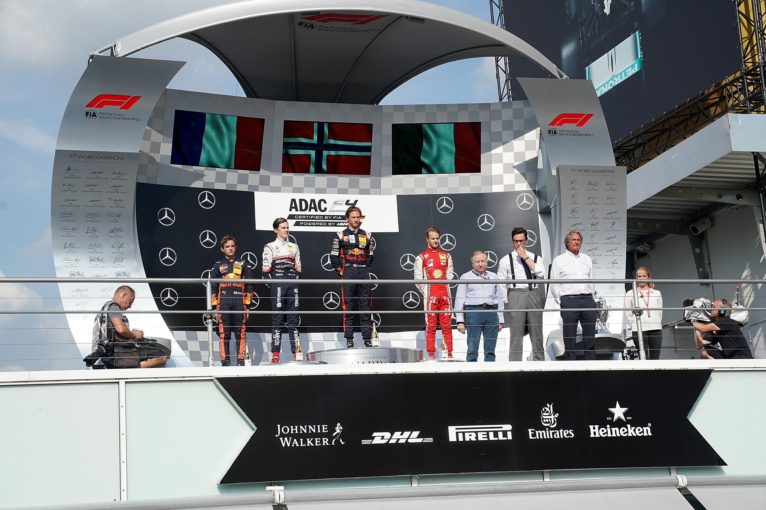 VIPs on podium: Jean Todt, President of the FIA, and Toto Wolff, Motorsport Director at Mercedes-AMG, were delighted to recognise the achievements of the winning drivers from the ADAC Formula 4. Together with ADAC Sports President Hermann Tomczyk, they presented the winner's trophies to Dennis Hauger, Théo Pourchaire, Gianluca Petecof and rookie, Roman Stanek, on Saturday. "It was great. The atmosphere here is generally terrific. Todt is a real legend and it was a great honour for me to receive my trophy from him," said Hauger while Pourchaire was delighted when Toto Wolff handed him his trophy: "He's one of motorsport's greats, but I've only ever known him from TV until now!"