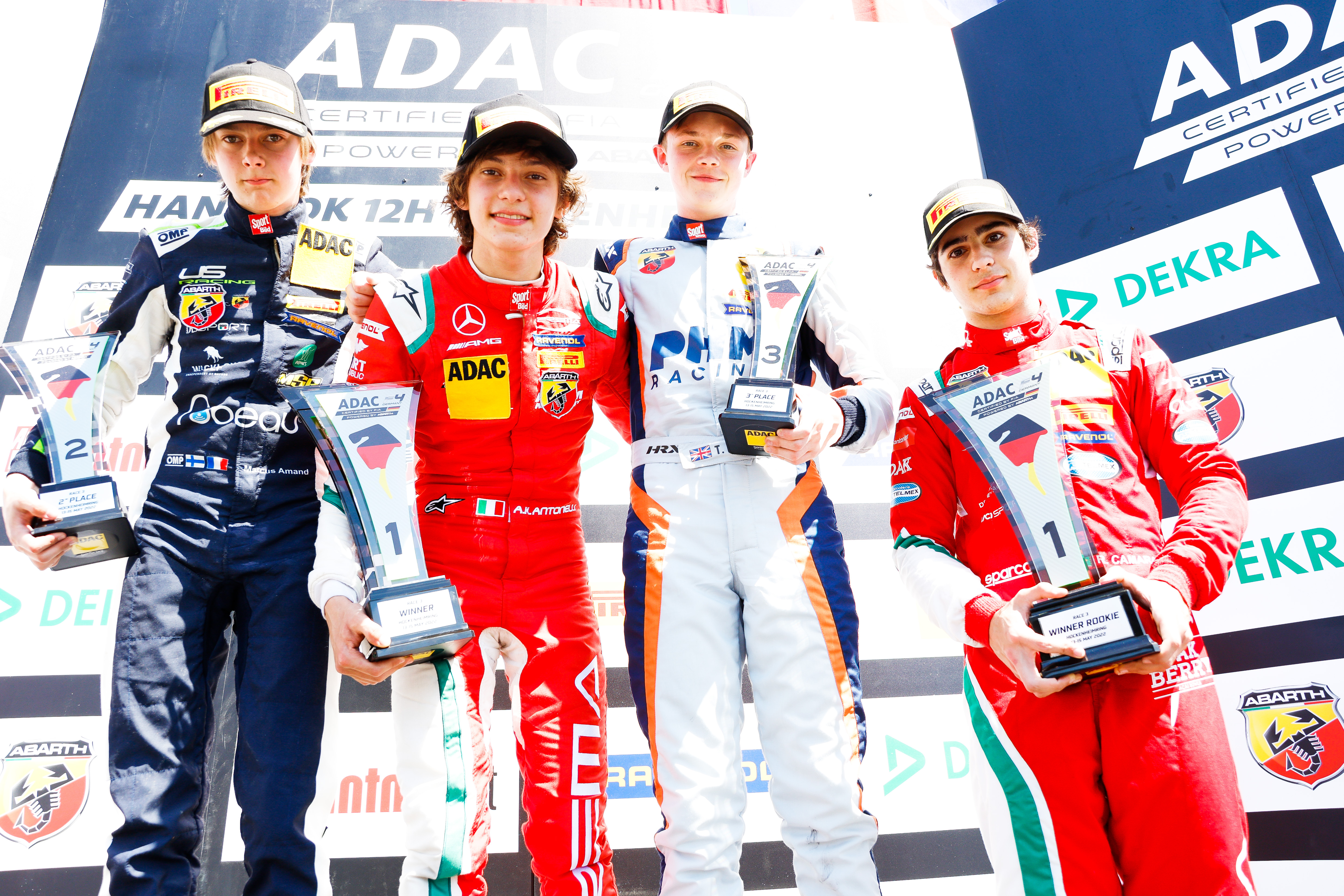 Hockenheim. Perfect weekend for Andrea Kimi Antonelli: The Prema driver took victory in both ADAC Formula 4 races on Sunday. The Italian came through from eighth place on the grid to win an action-packed sixth race of the season at the Hockenheimring Baden-Württemberg. Marcus Amand (FRA) and Taylor Barnard (GBR/PHM Racing) joined him on the podium after the second race of the day. Rafael Camara (17/BRA/Prema Racing and Nikita Bedrin (ITA/PHM Racing) had previously completed the podium in the day’s opening race. Antonelli became only the second driver in the history of the junior series to win three races on one weekend. “I am overjoyed with both victories. It is unbelievable that I still managed to win despite the reverse grid rule, but I never gave up. This weekend has given me even more confidence,” said the Mercedes Junior.