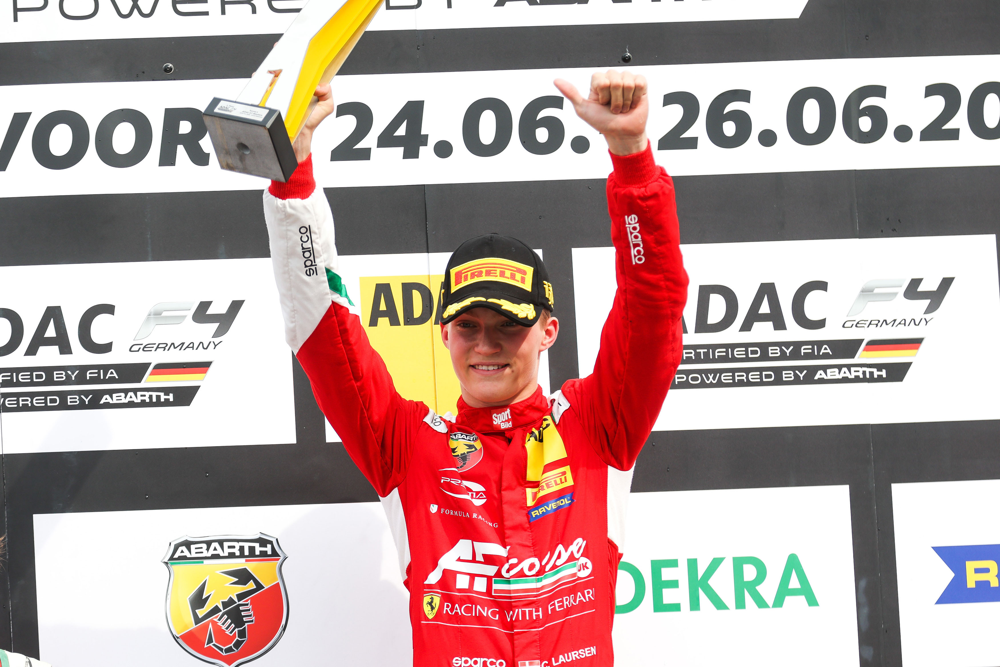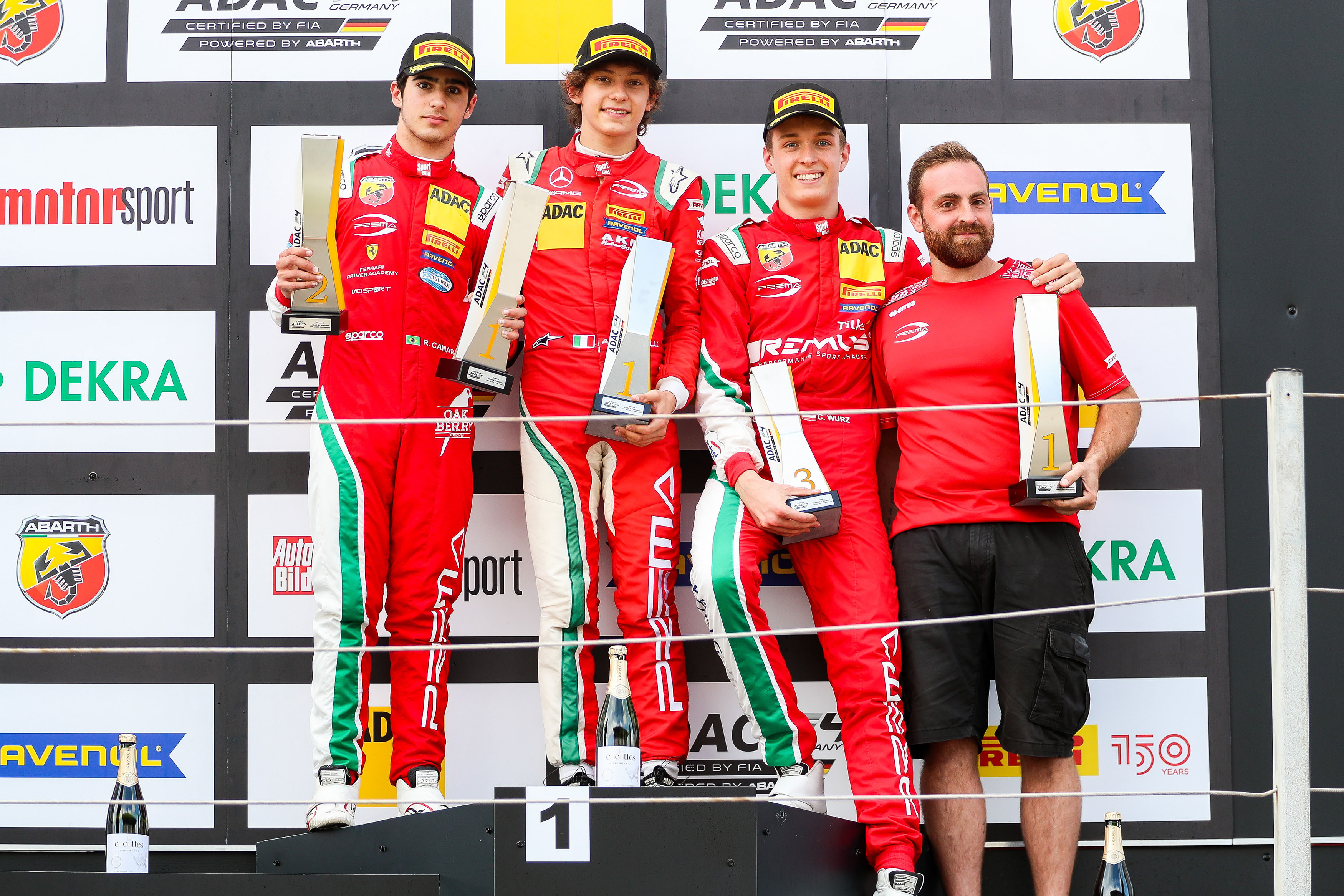 Zandvoort. A first for Conrad Laursen (Prema Racing): The Dane celebrated his first victory in ADAC Formula 4 in the ninth race of the season, which took place at Circuit Zandvoort and featured on the support programme for the ADAC GT Masters. Andrea Kimi Antonelli (15/Prema Racing) and Charlie Wurz (17/Prema Racing) from Austria joined him on the podium. In the morning, Italy’s Antonelli had claimed his seventh win of the season, while Rafael Camara (17/BRA/Prema Racing) and Wurz finished second and third. “I am overjoyed and delighted with the win. Particularly as Kimi really put me under pressure in the final few laps. The tyres were pretty trashed and I lost a lot of time as a result, but I was able to hold on to first place,” said the 16-year-old. Formula 1 flair came courtesy of two-time world champion Emerson Fittipaldi and former Ferrari driver Luca Badoer. Their sons, Emerson Fittipaldi jr. (15/BRA) and Brando Badoer (15/ITA), drive for the Dutch team Van Amersfoort Racing this season. Wurz was also able to call on the support of his father, former Formula 1 driver Alex Wurz.