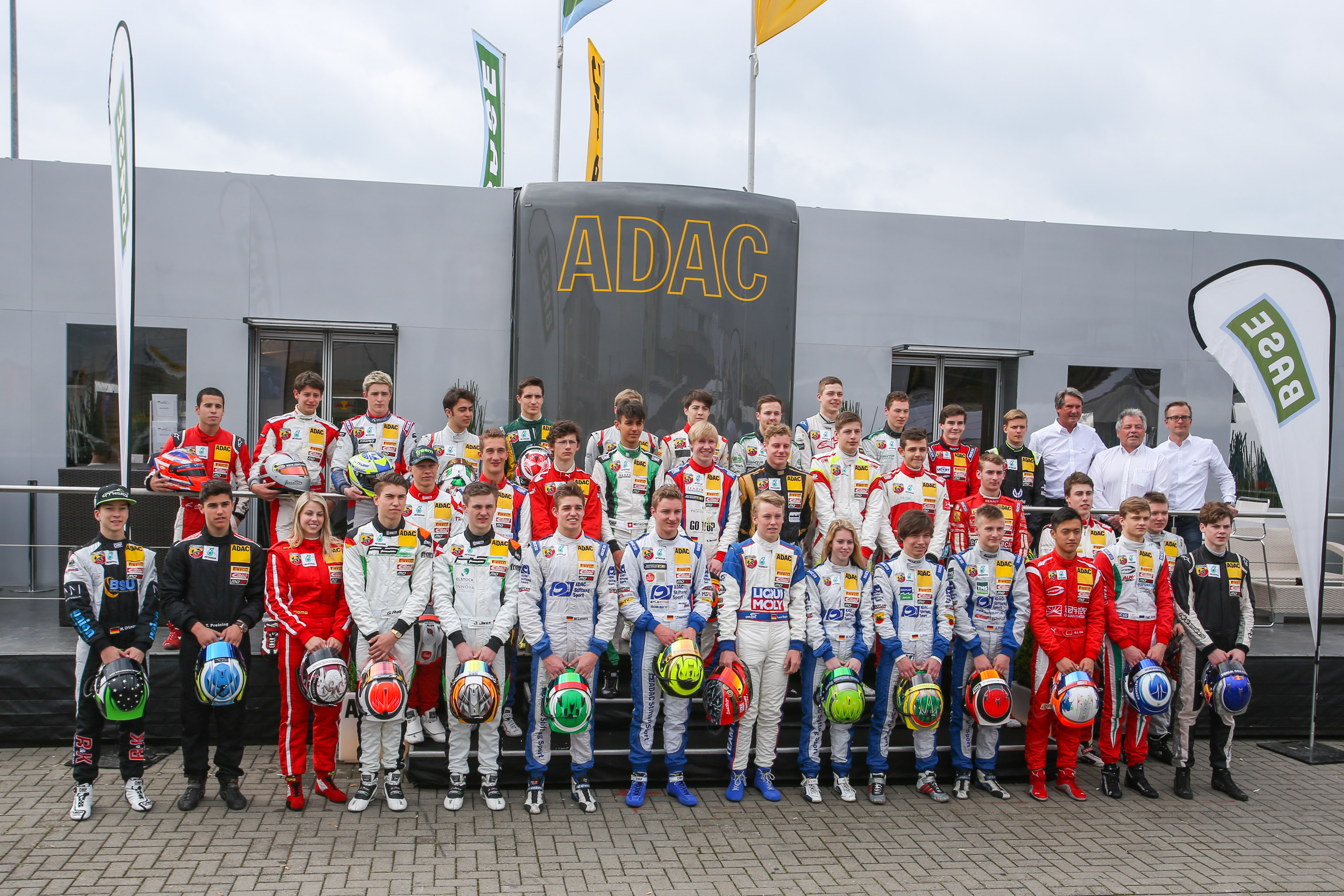 Neue Generation: Die Nachwuchstalente der ADAC Formel 4 setzten eine langjährige Tradition der Vorgängerserie, dem ADAC Formel Masters, nahtlos fort: das Gruppenbild aller Fahrer vor der ADAC Hospitality im Fahrerlager. Am Sonntagvormittag trafen sich die jungen Fahrer gemeinsam mit ADAC Sportspräsident Hermann Tomczyk, ADAC Wagenreferent Jürgen Fabry und ADAC Motorsport-Chef Lars Soutschka zum Gruppenfoto.